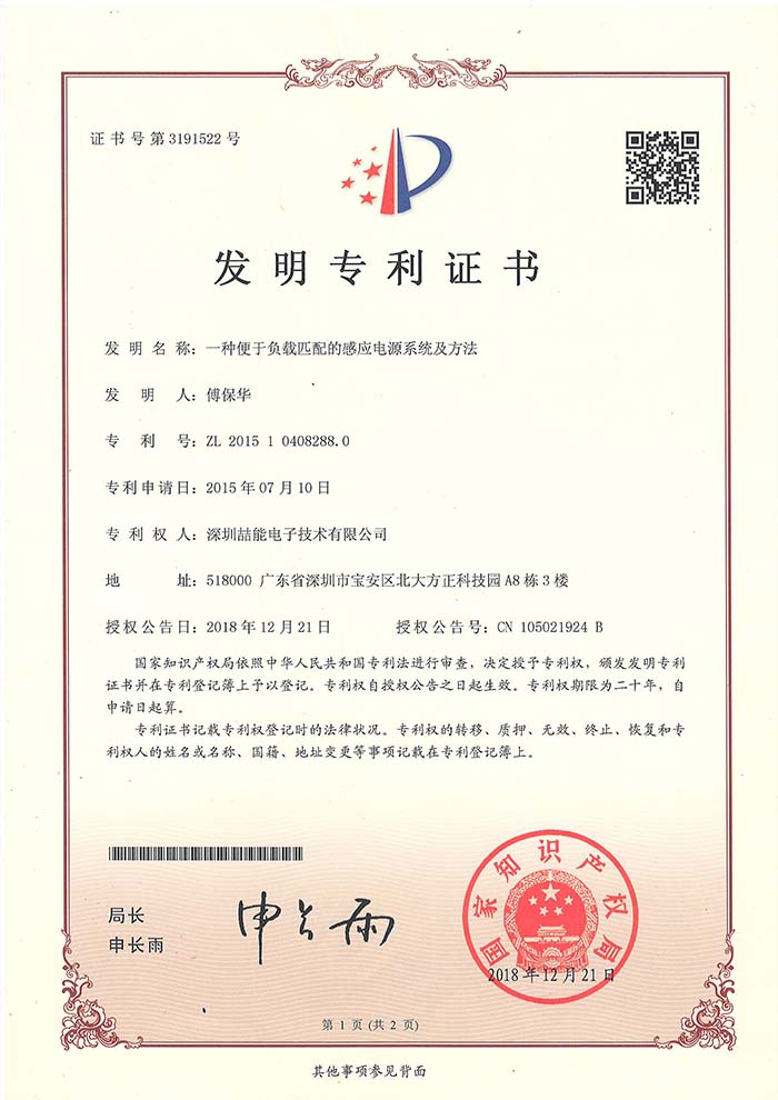 發明專利證書:一種便于負載匹配的感應電源系統及方法
